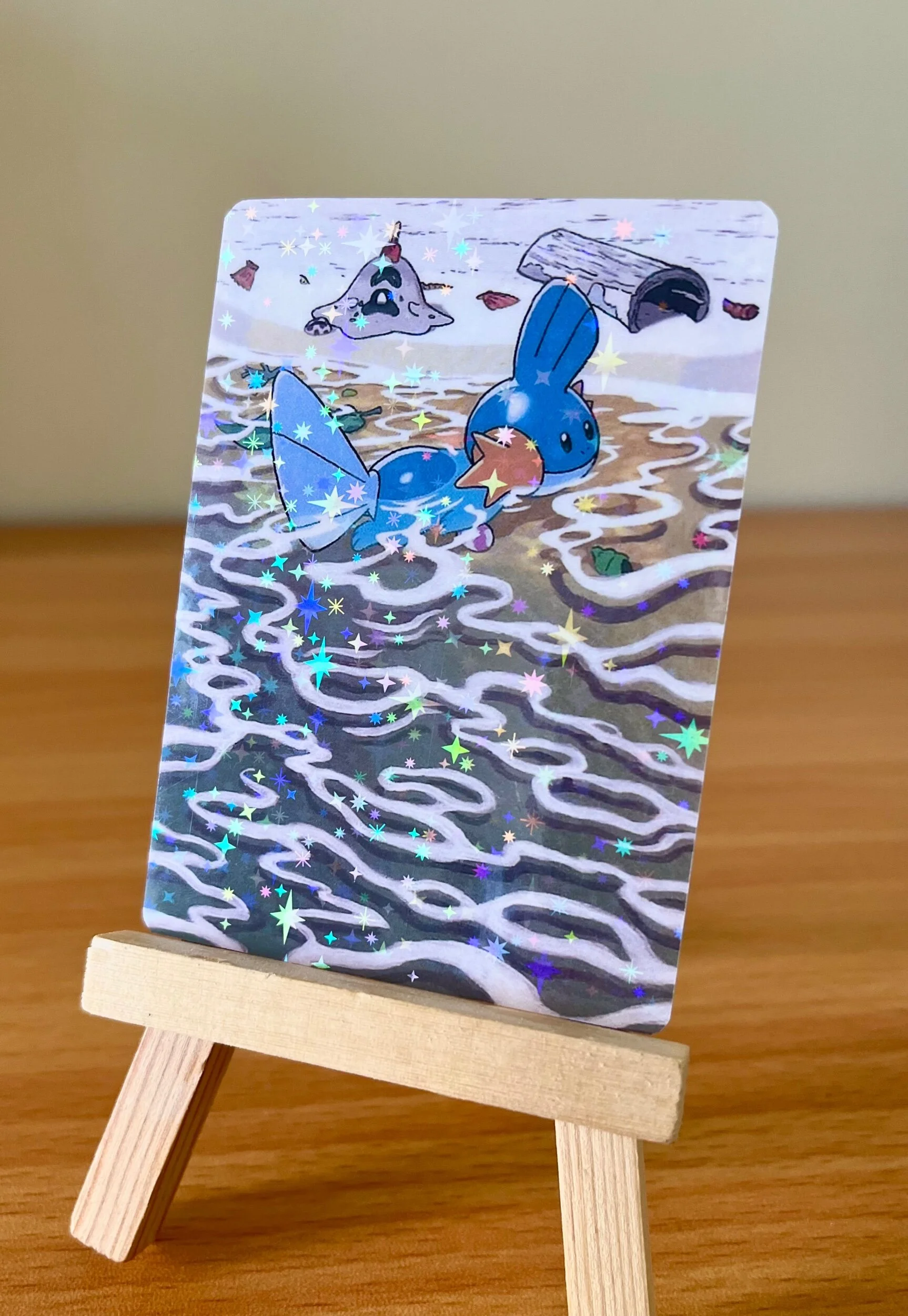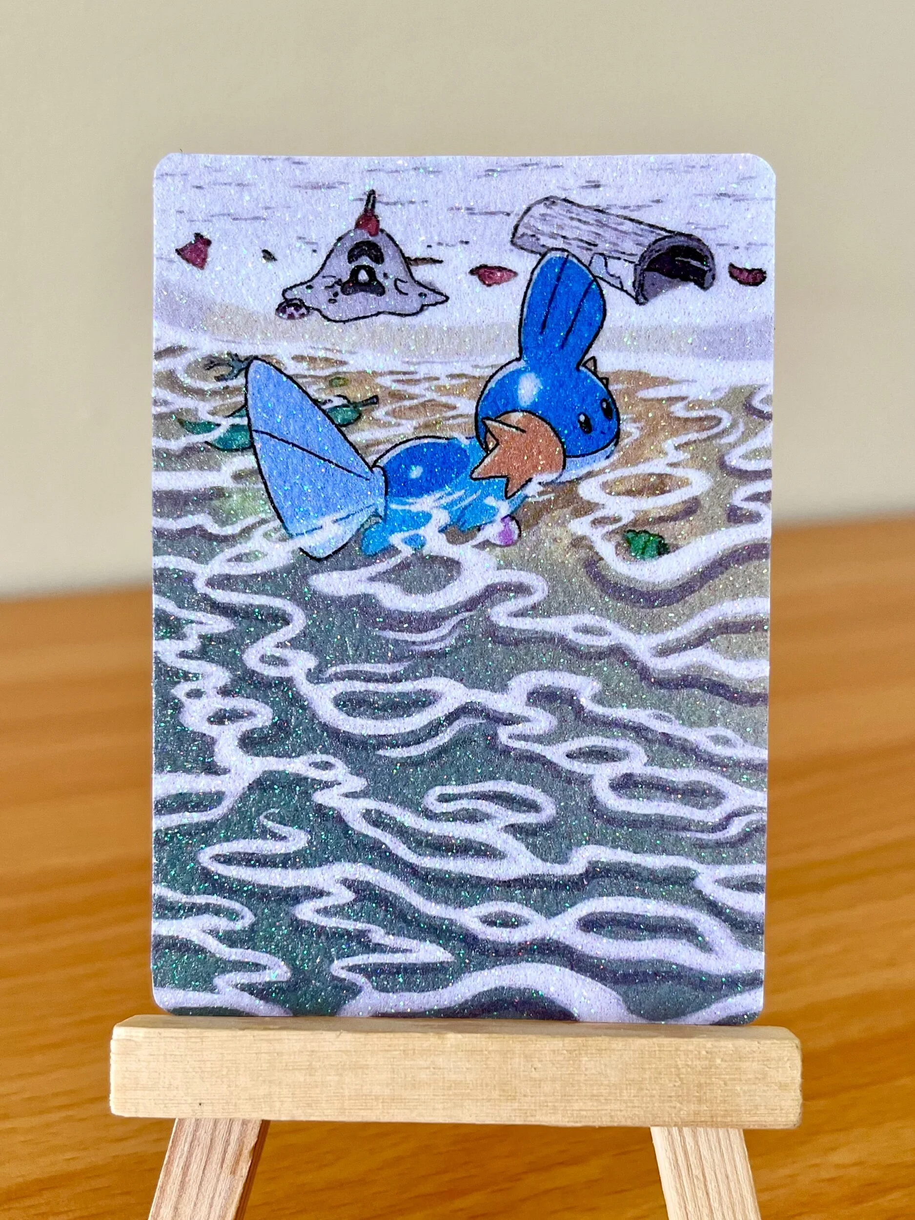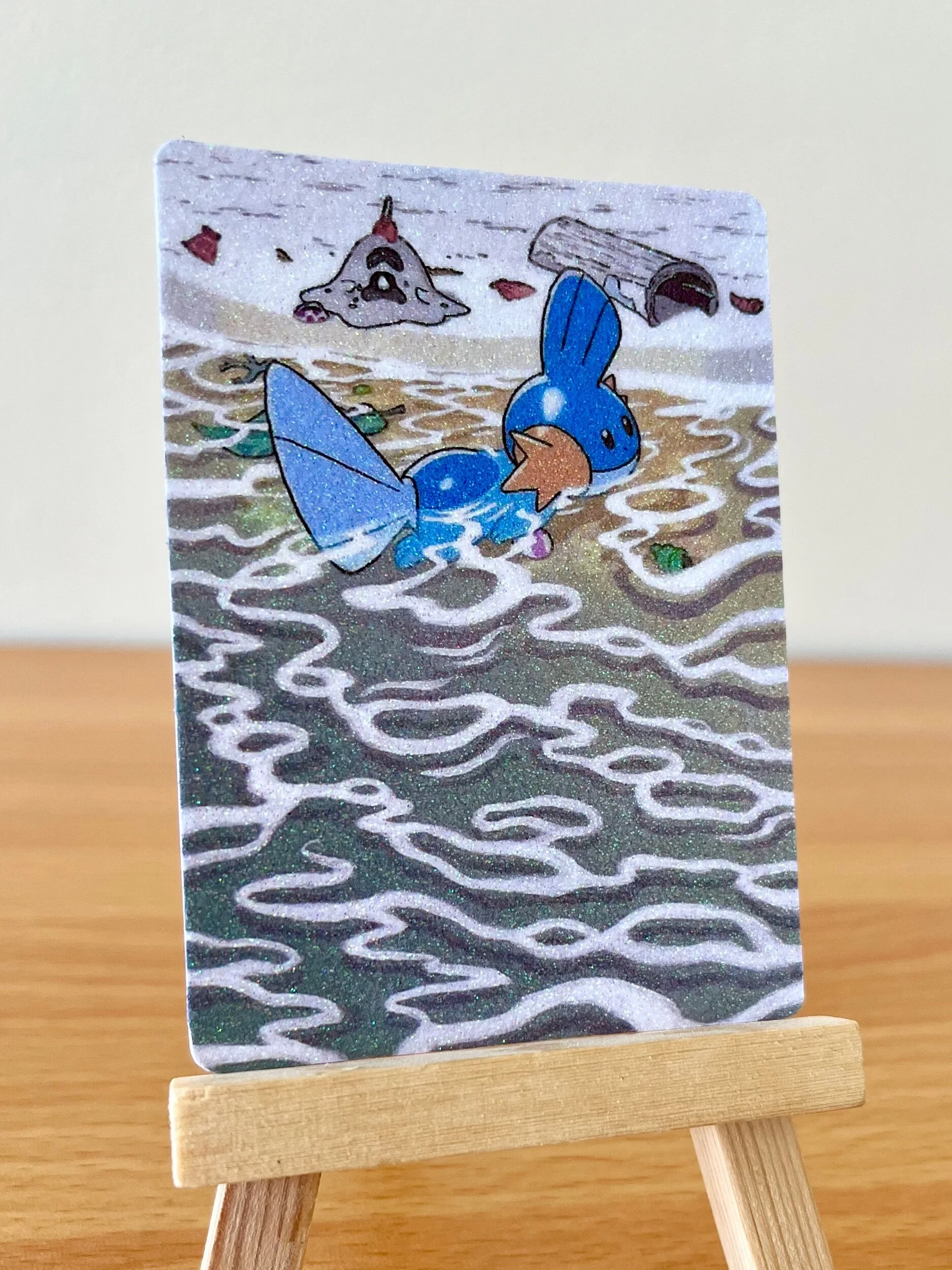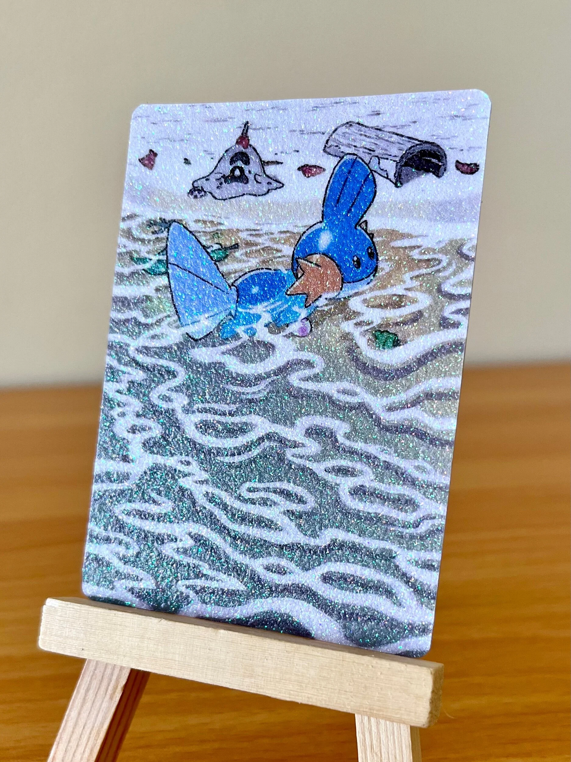 Reproduction print of my Seadra Full Art design. Card Prints are available in several holo patterns including: Star Pattern, Shattered Glass, Twinkle, Laser, Shimmer, Heart, Snowflake, Firework, Superstar, Floral, Confetti, Starburst, Speckle, Pixel, Sparkle Coat, and Glitter prints. Be sure to check all of the photos in the listing to differentiate between the holo options. Printed on a real Pokemon card, featuring the official card backing.