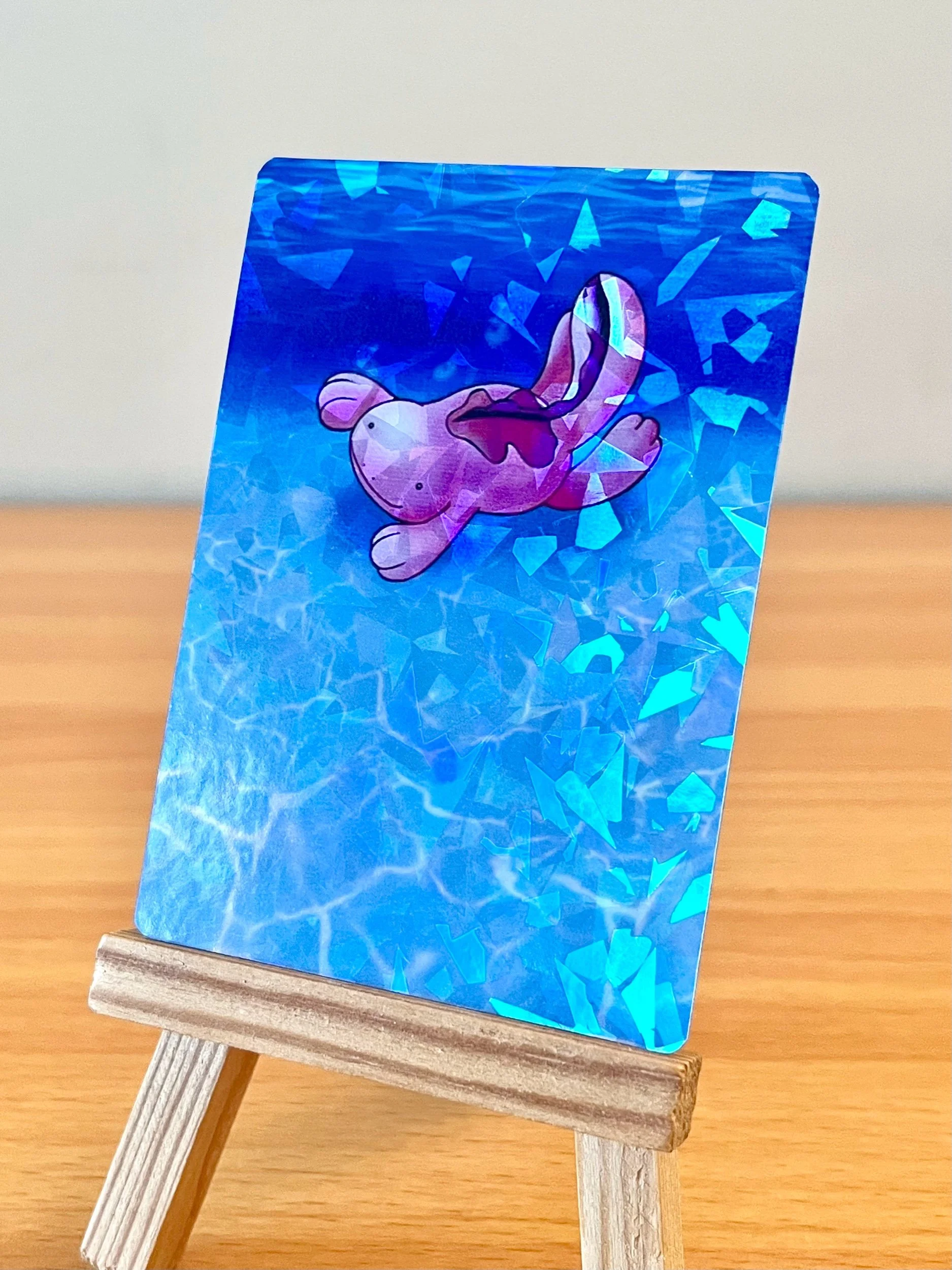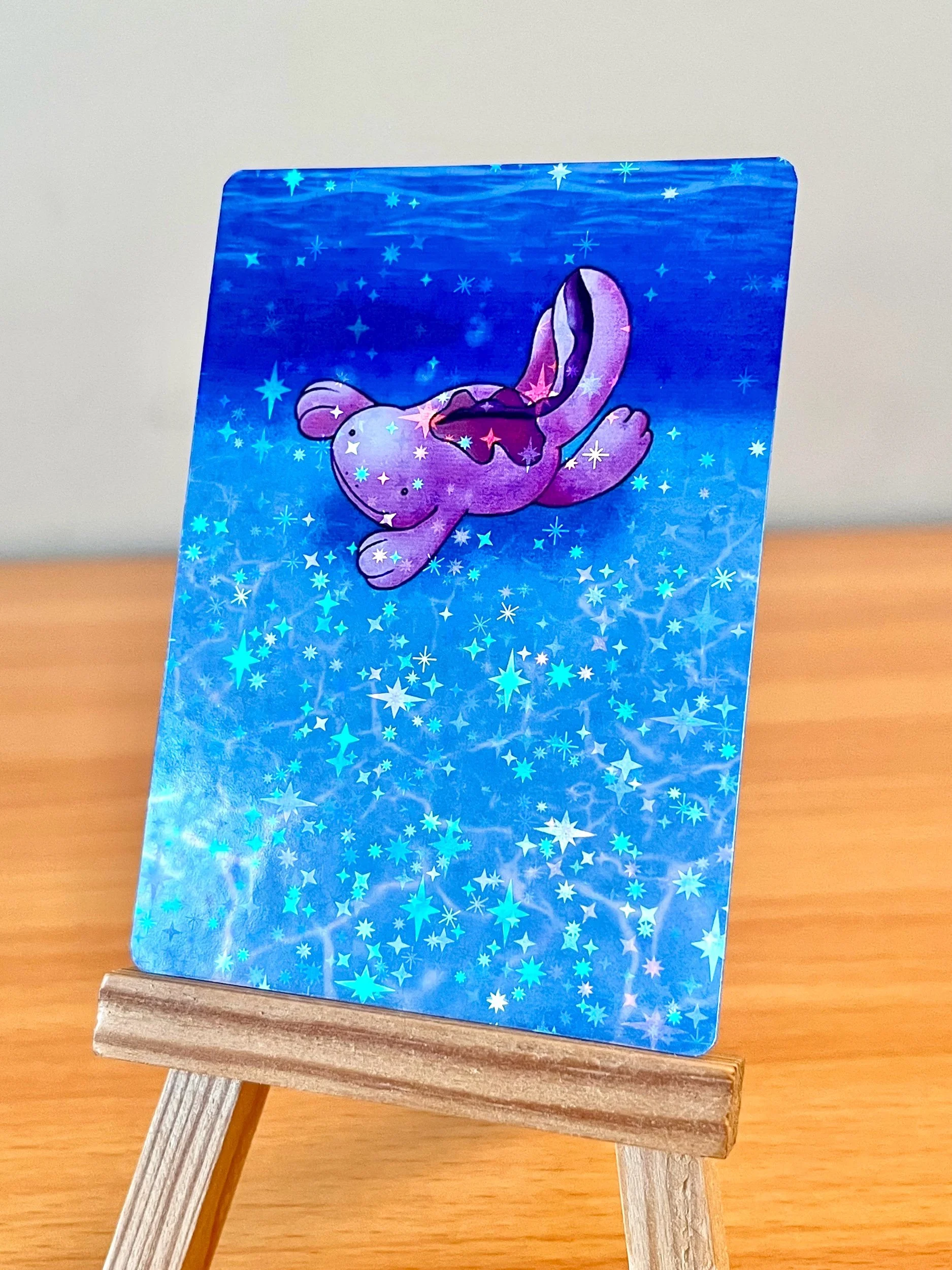 Reproduction print of my Shiny Quagsire Full Art design. Card Prints are available in several holo patterns including: Star Pattern, Shattered Glass, Twinkle, Laser, Shimmer, Heart, Snowflake, Firework, Superstar, Floral, Confetti, Starburst, Speckle, Pixel, Sparkle Coat, and Glitter prints. Be sure to check all of the photos in the listing to differentiate between the holo options. Printed on a real Pokemon card, featuring the official card backing.